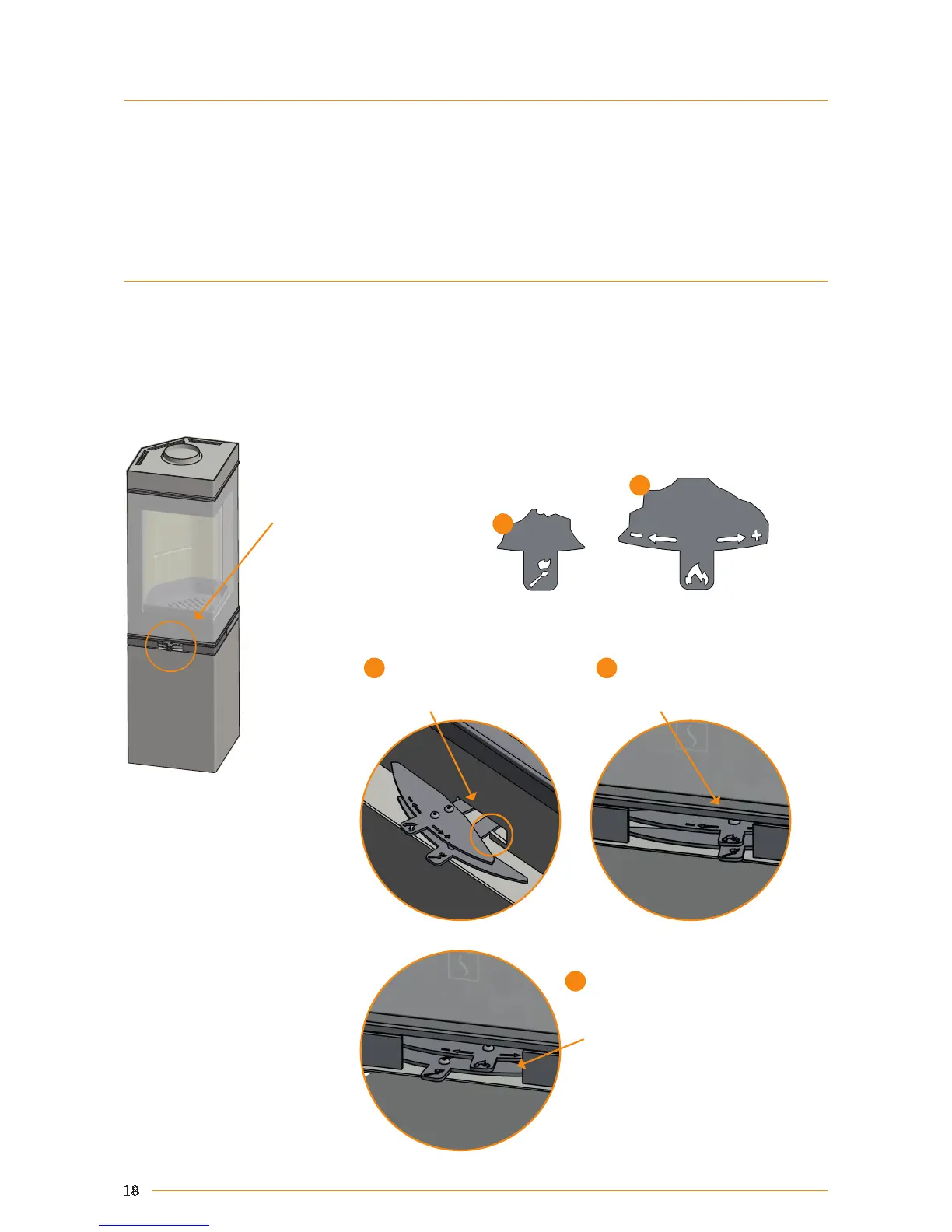 When firing a cold stove, pull both dampers to the right. The primary air damper will meet a stop (3).