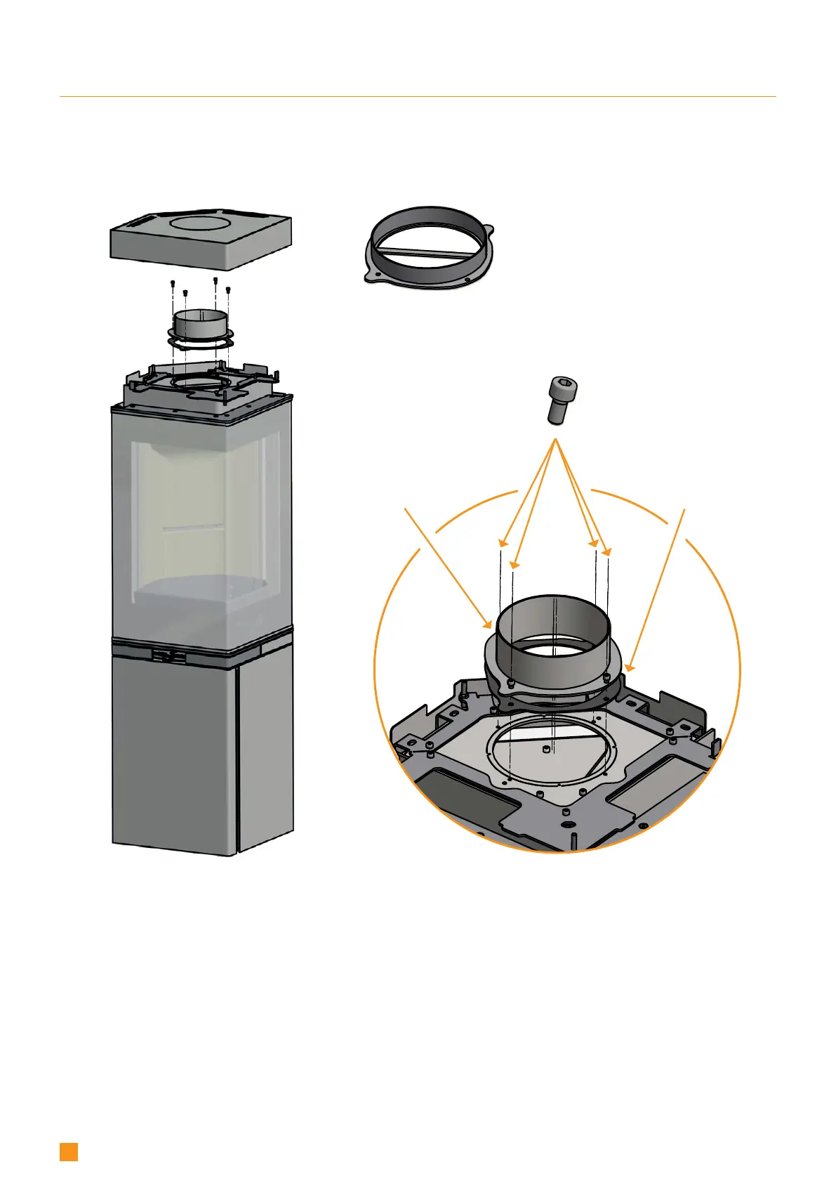 Mount the ceramic gasket on the connecting piece. Tighten the flue connection piece with the screws provided.