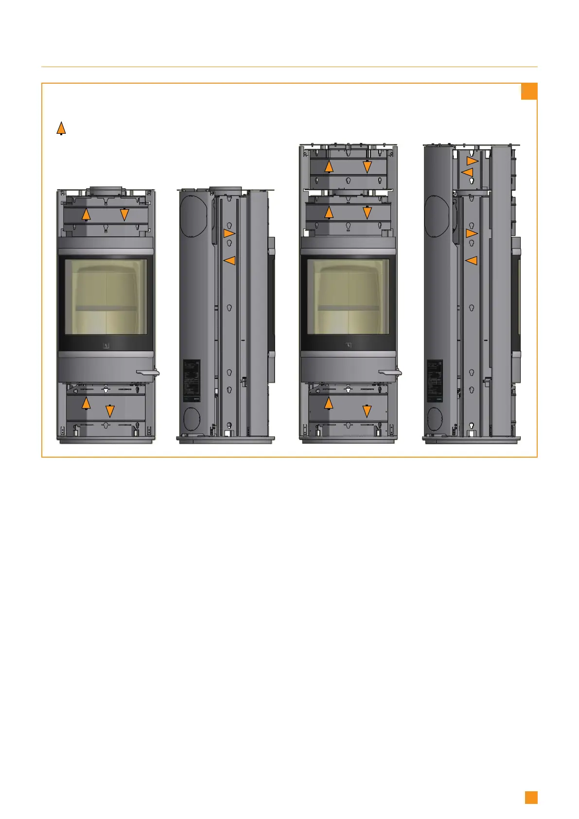 The delivered gasket (7/9 m) should be cut in appropiate lengths and sticked onto the sides of the stove as shown below