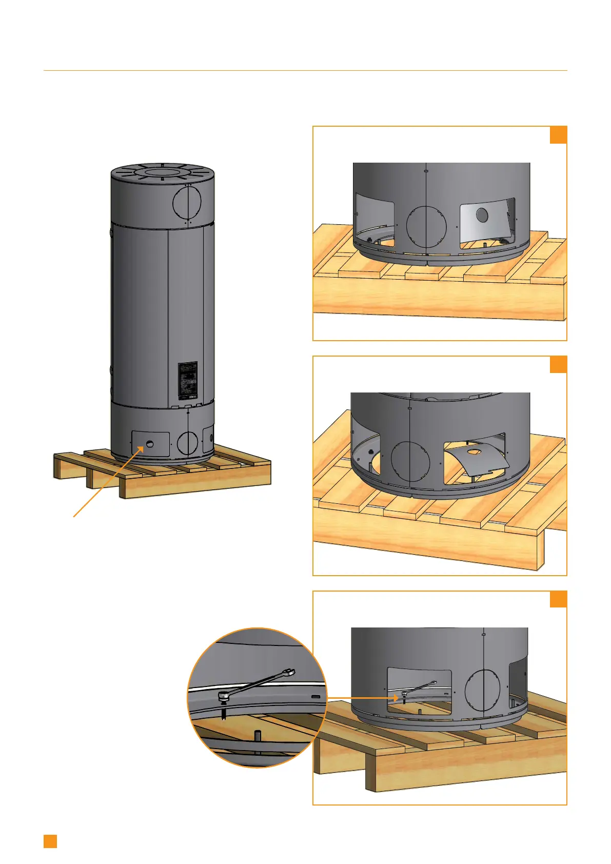 The stove comes attached to a wooden pallet on delivery. The four screws securing the stove may be removed through the two