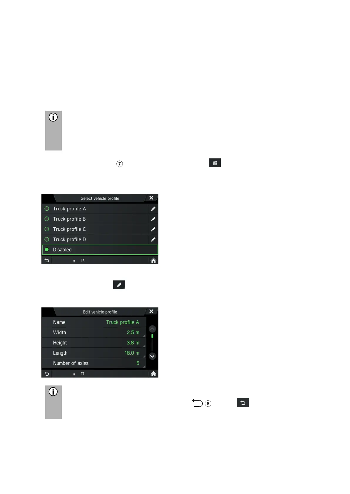 The navigation system is adapted to heavy vehicles. The vehicle profiles can be