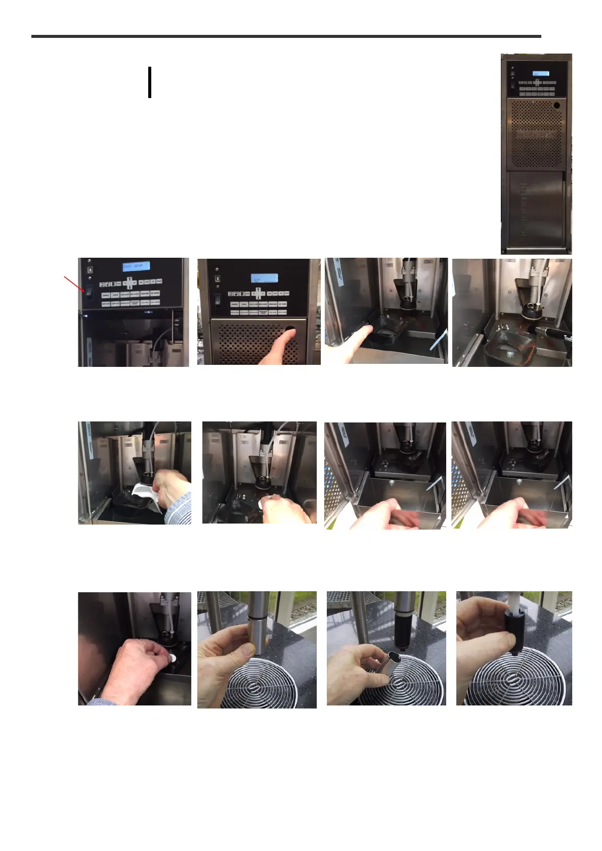 Turn off power switch Open door, and flip open Move the scraper with Remove dry coffee