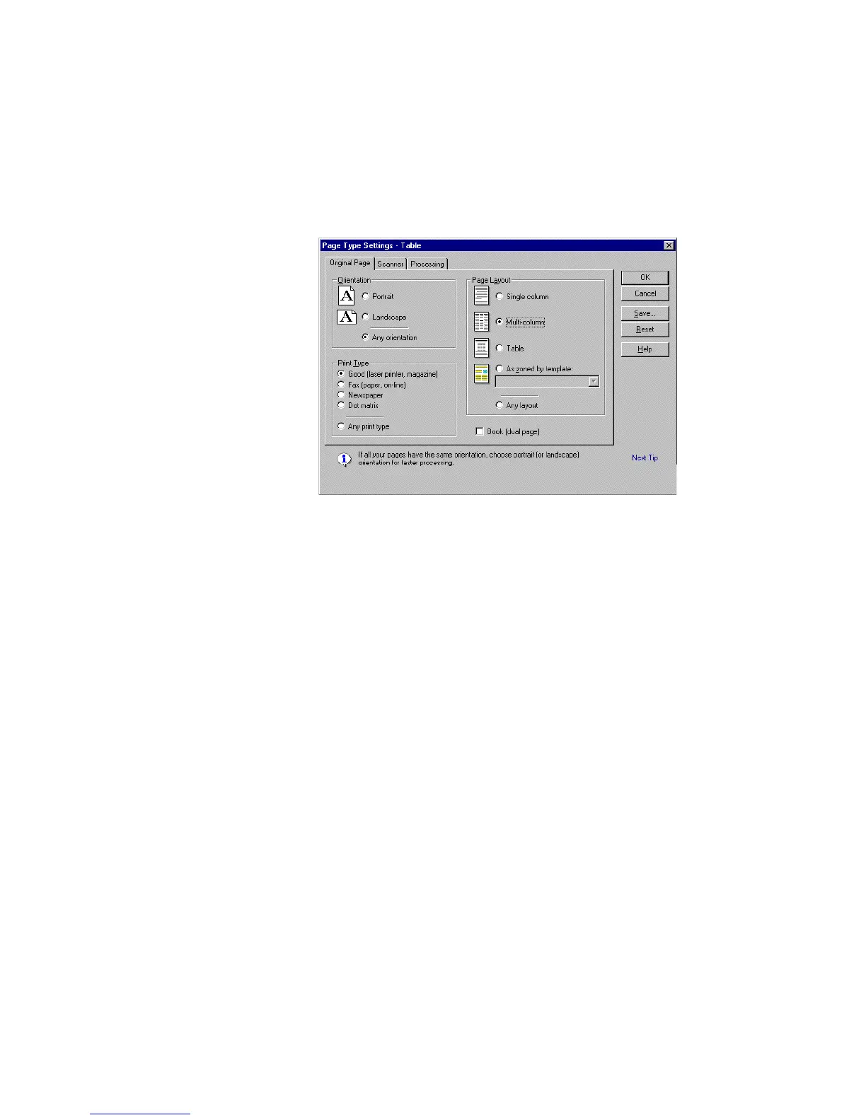 TextBridge modifies the settings for the Table page type based on