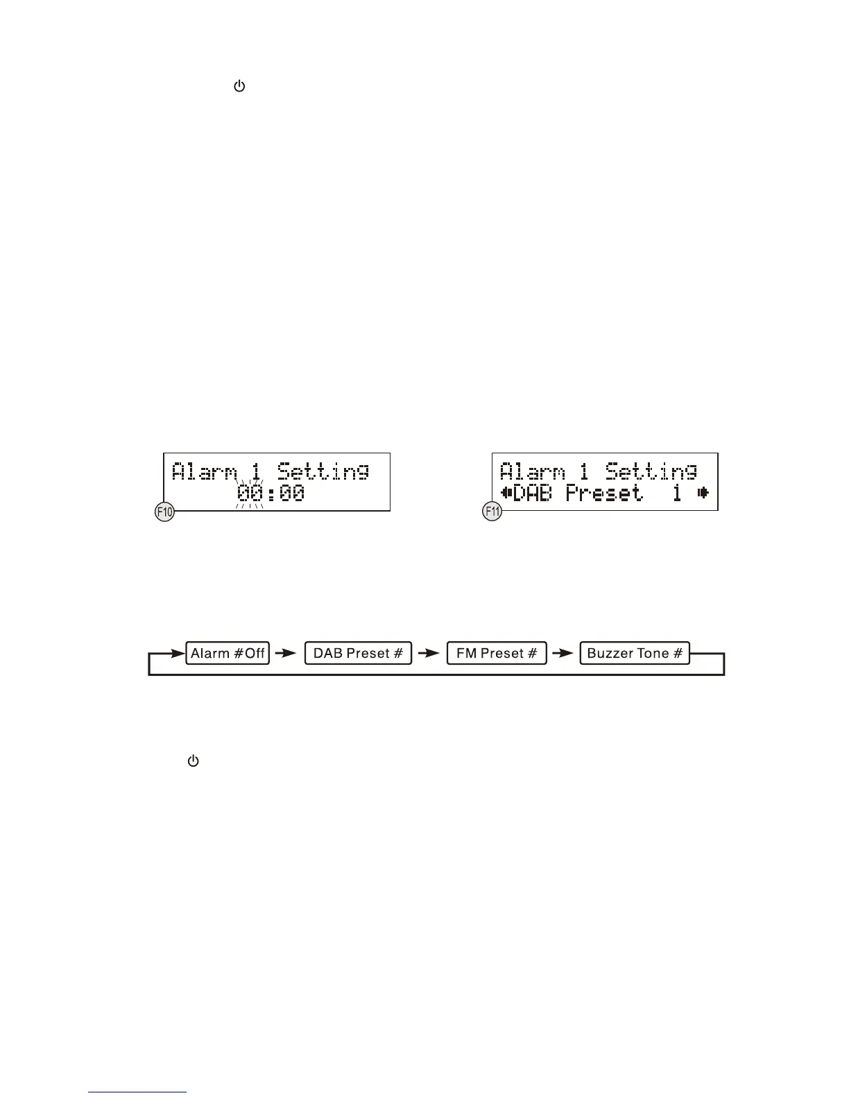 eller FM fast station (1-10), dernæst buzzertone (1 eller 2) og endelig lydstyrke for alarmen. (F11)