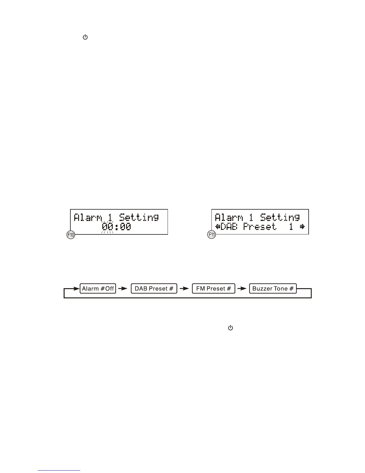 settings - first set the DAB and FM Preset (1-10), then the Buzzer Tone (1 or 2), finally the alarm Volume level.