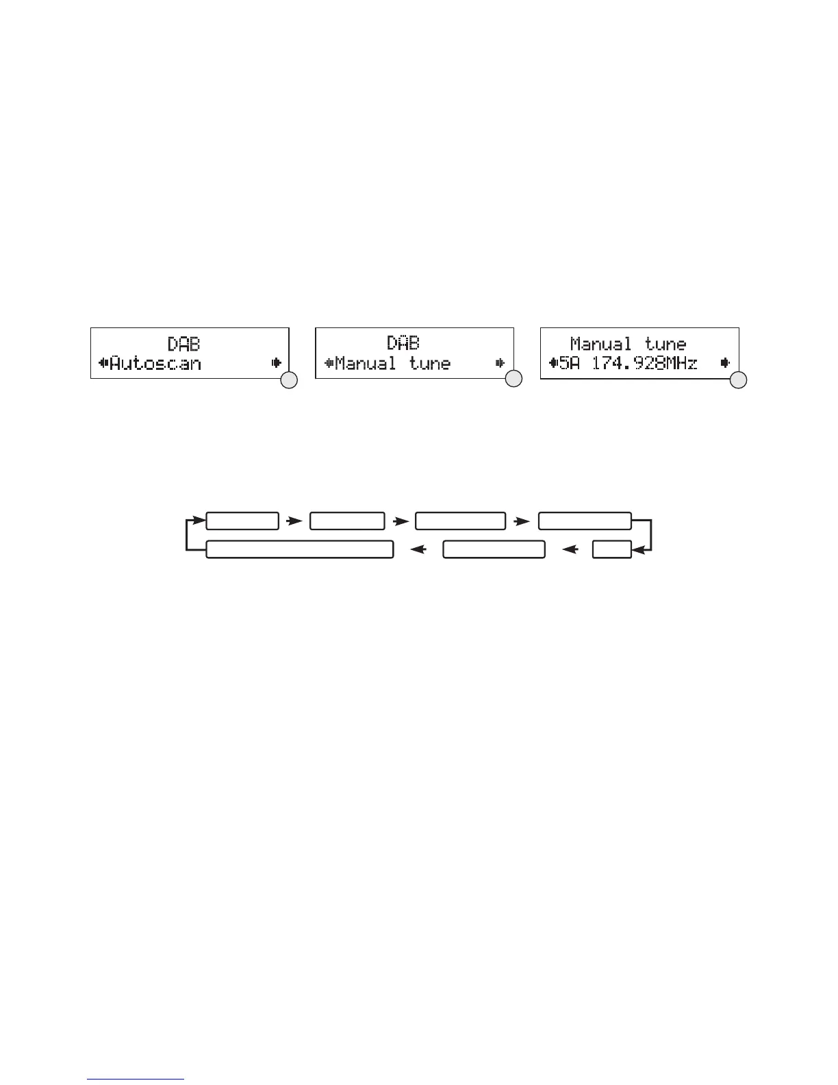 2. Press the ▲ or ▼ button to move through the DAB channels, the display will show “5A to 13F” and