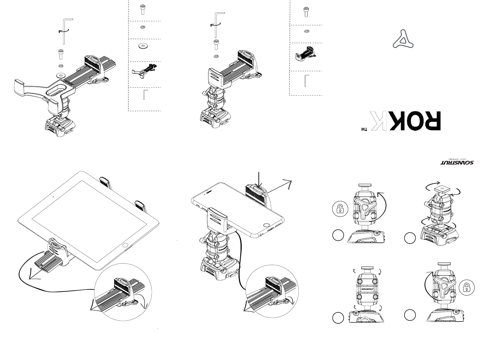 Scanstrut ROKK Mini RL 508 - Clamp and Body Assembly; Tablet Clamp RL-508 and Phone Clamp RL-509 Attachment; 360 Body RLS-AM Adjustment