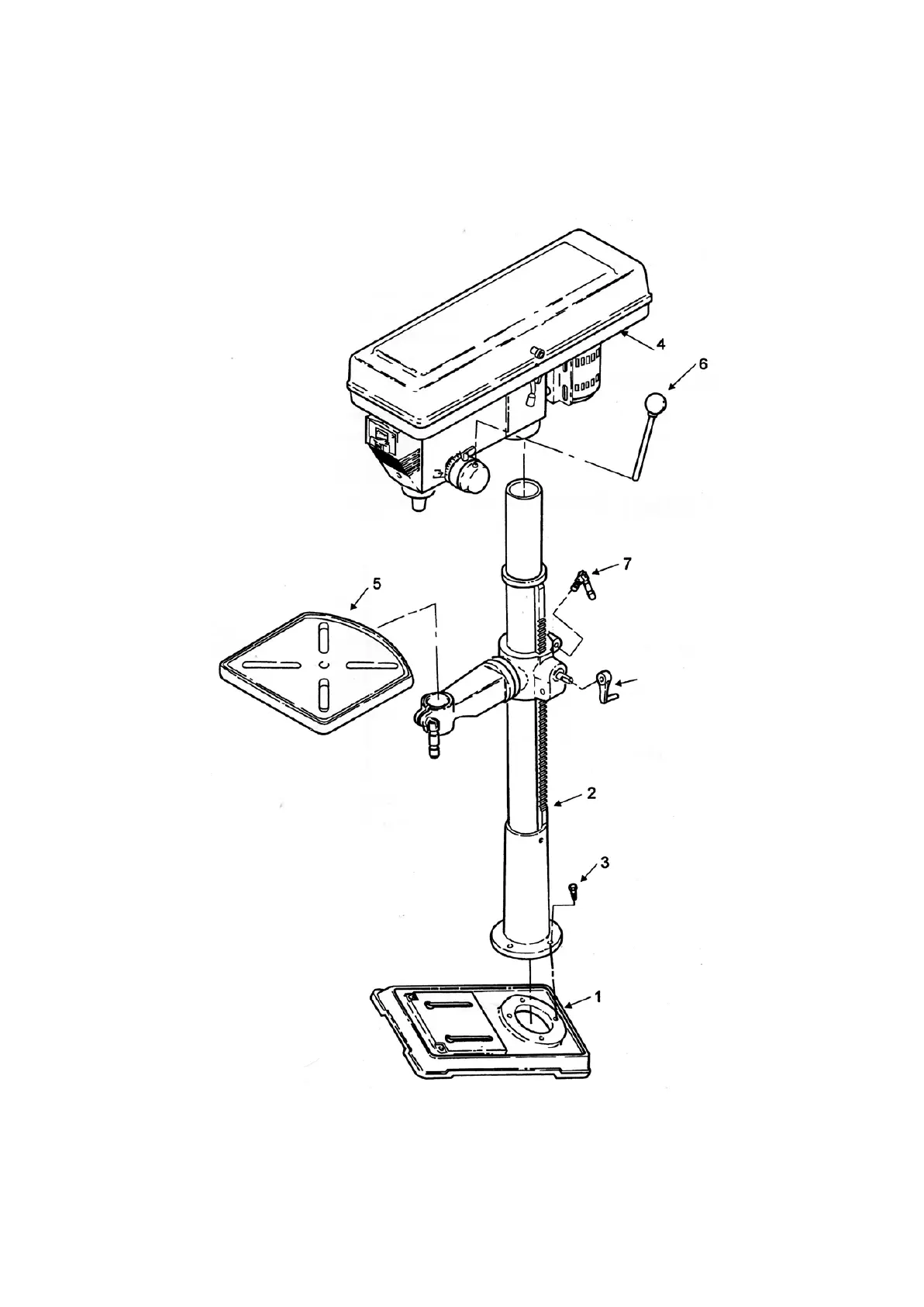 1: Base; 2: Column/w Support Asm 3: M10*1.5-40Screw(4); 3: Head Asm; 5: Table; 6: Feed Handle; 7: Clamp-