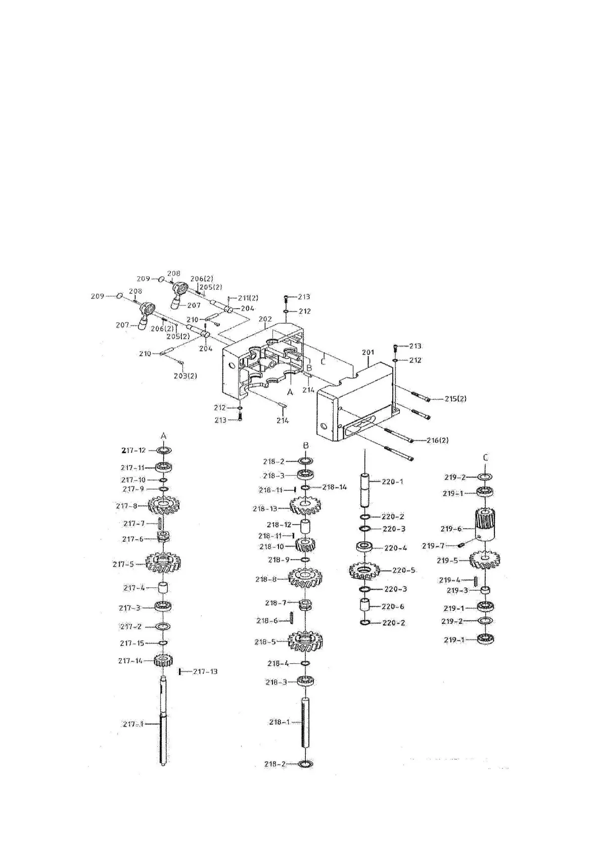 Splittegning af gearkasse til SB 30 og 40 /Drawing of Gearbox SB 30/40