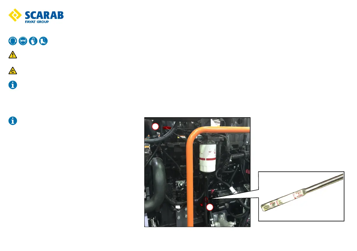 Ensure that the sweeper is on a flat and level surface with the auxiliary engine stopped for a suitable period, to allow the oil to return to the sump.