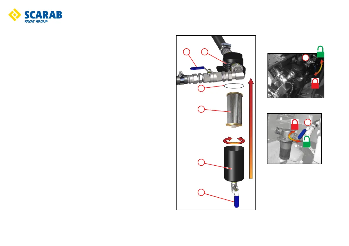 3. Unscrew the filter bowl e clockwise from the housing r and remove the