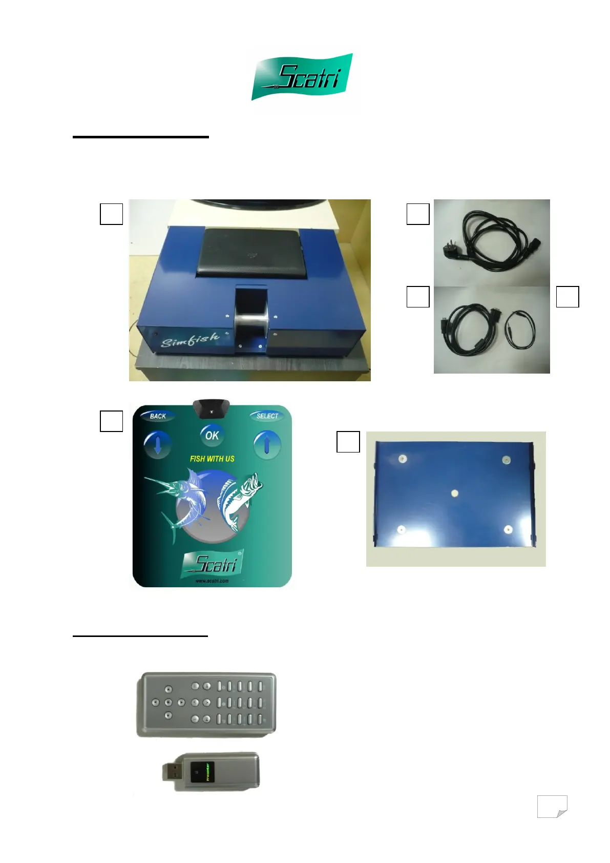 The Simfish kit is made up of a simulator (1), a power cable (2), a VGA cable (3), an