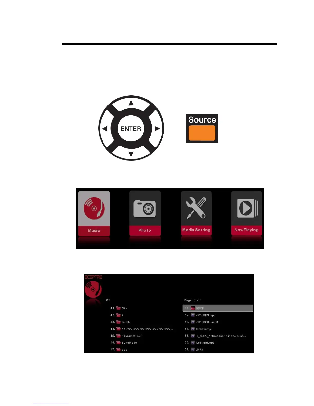 Once you press the USB button the USB menu will come up. Select either the music or picture you