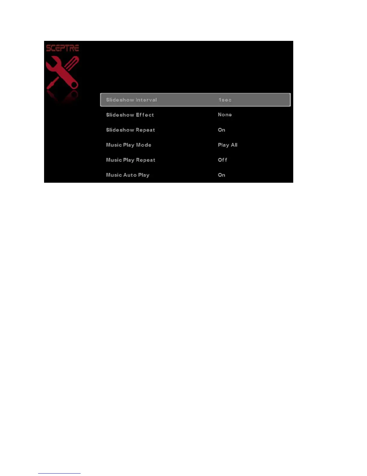 3. SLIDESHOW REPEAT – This option toggles the repeat function for displaying pictures.
