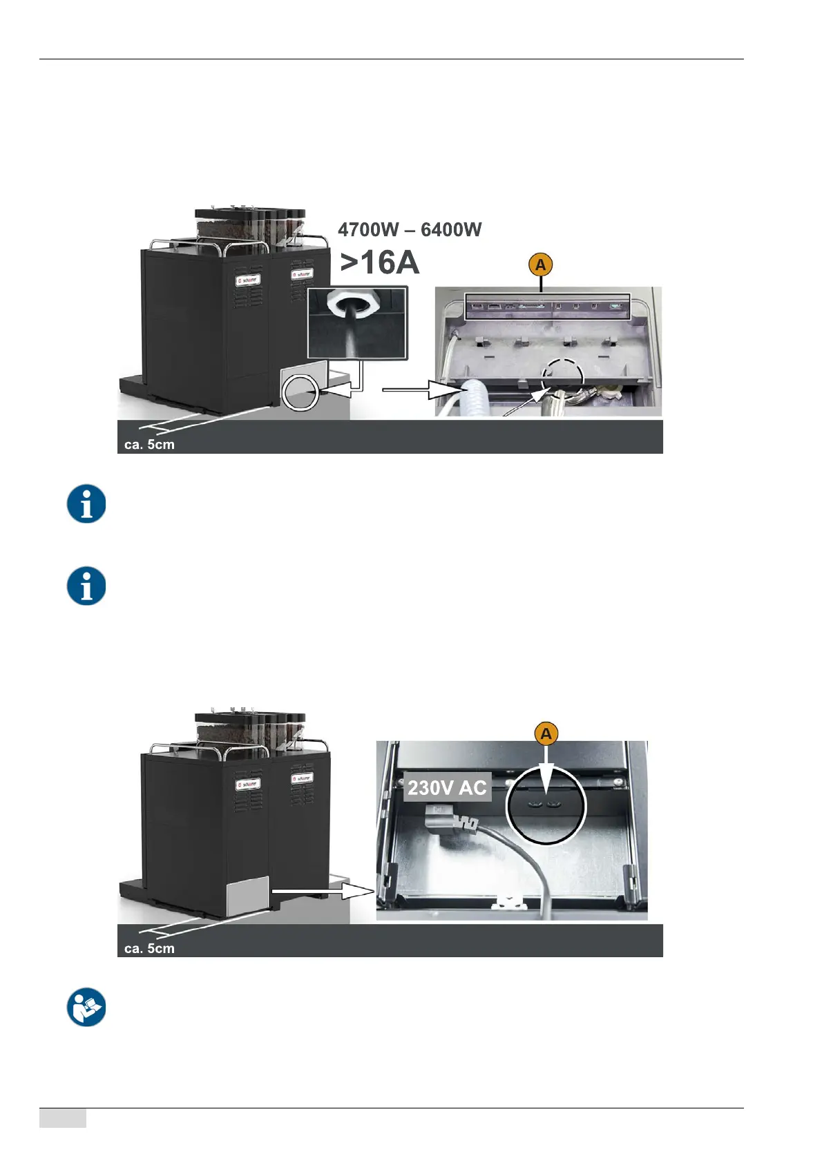 The machine is equipped with a permanent cable connection at the factory. On the building side, the machine is