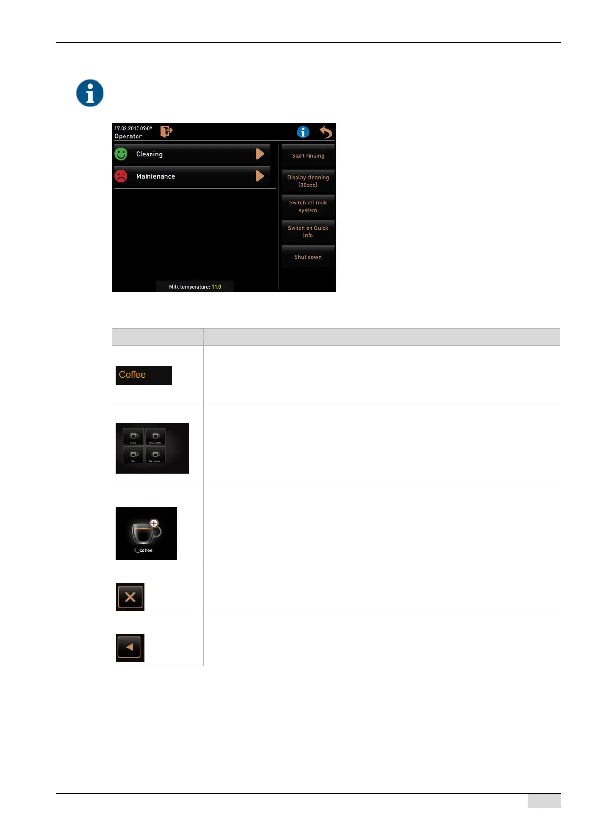 Stop The [Stop] field is displayed while a beverage is being dispensed. The beverage currently