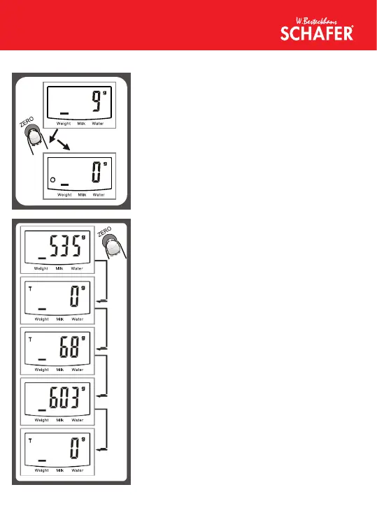 LCD will show “-----” or “0g” each time ZERO