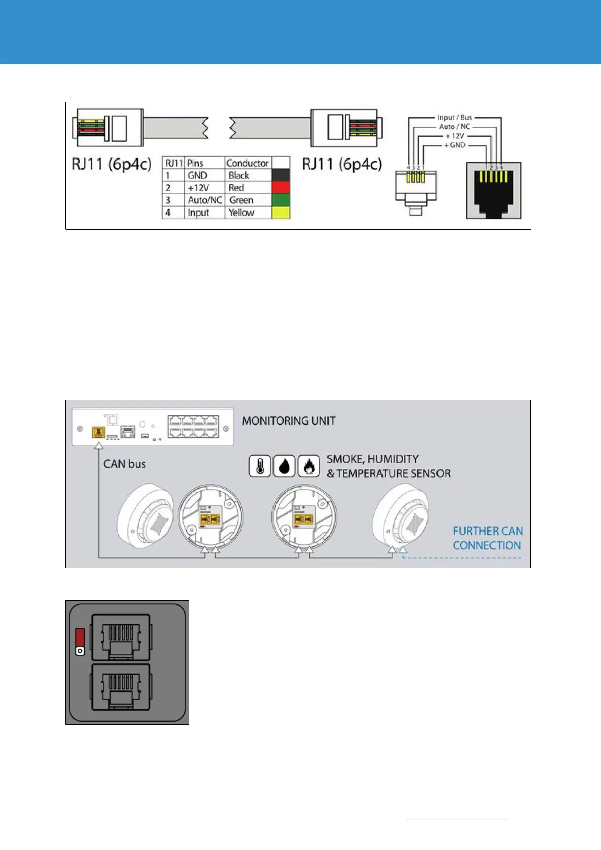 Connect one end of the RJ11 / RJ12 cable to the monitoring unit and the other end to one of the two inputs of the