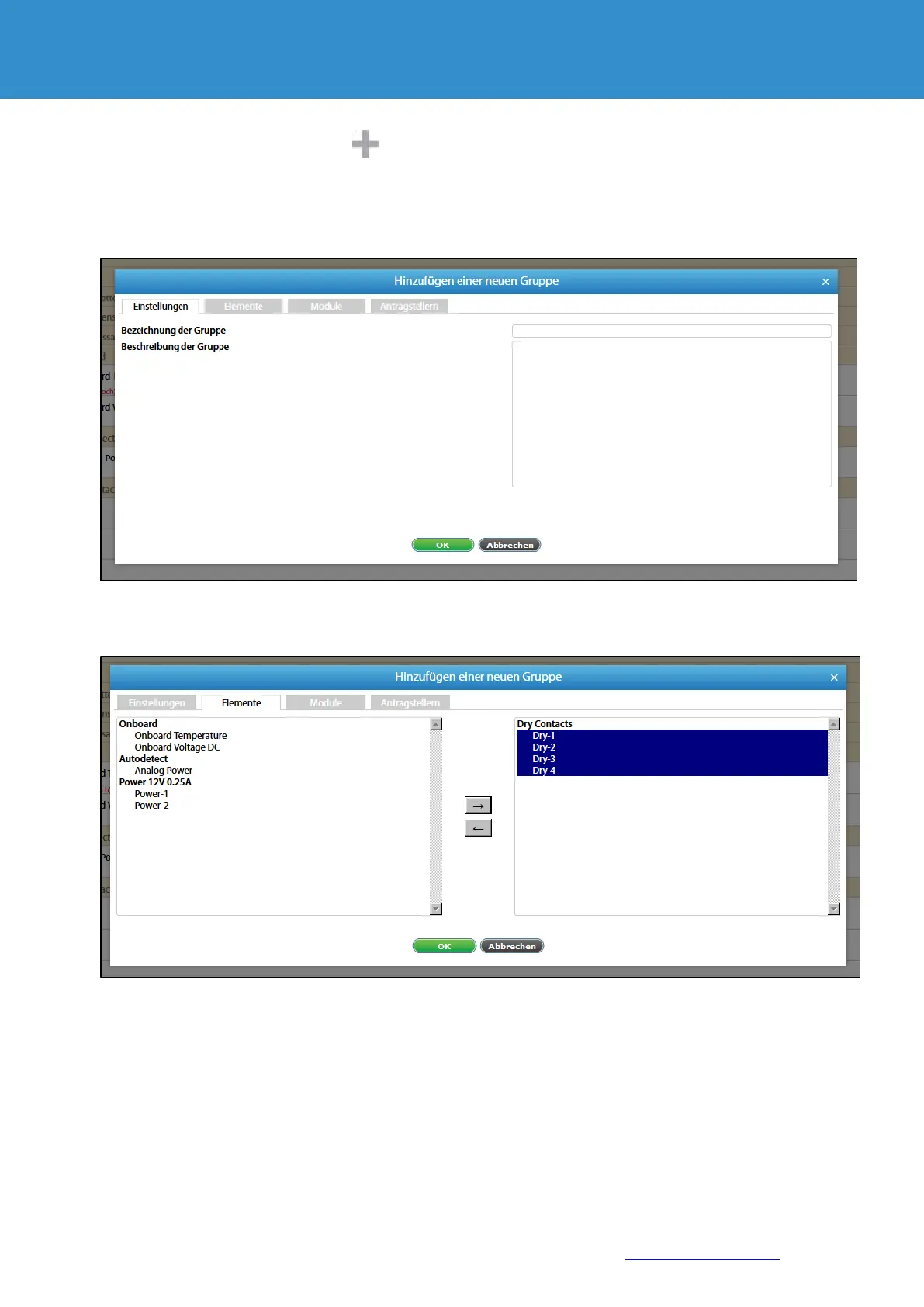 Add the necessary elements and modules to the group and save the new group with "OK".