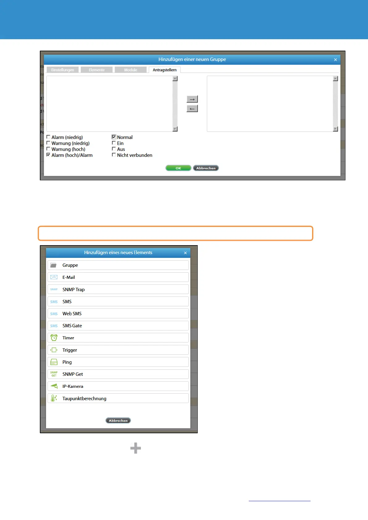 Caution! The notification takes place only via groups of elements or using a logic diagram.