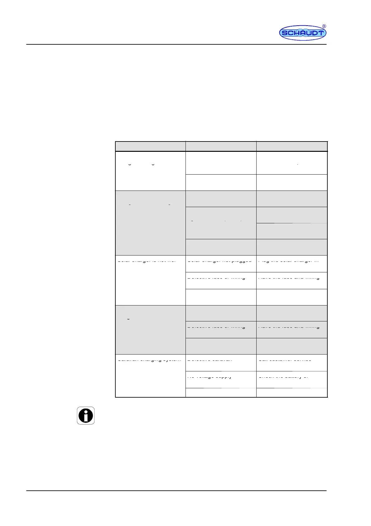 Solar charger is not wor- Solar charger not plugged Plug the solar charger in