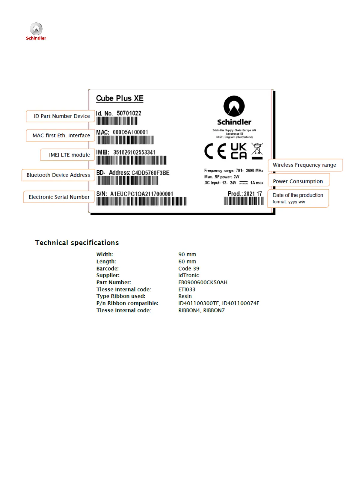 Schindler Cube Plus - 8 - Label; Cube Plus XE Label Information