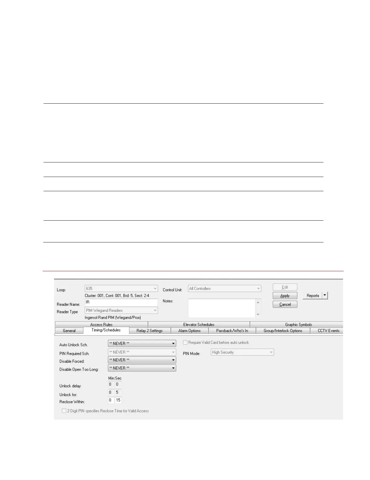 The Schedules tab contains fields that affect the timing of the locking and unlocking at the reader. Disabled (grayed)