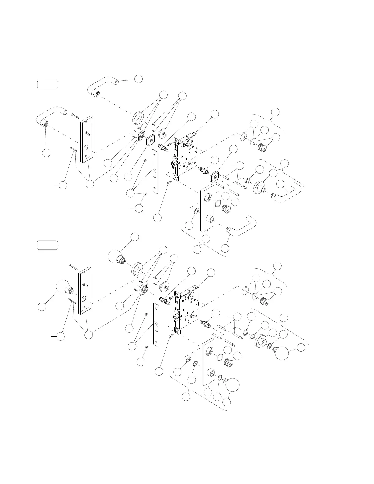 NOTES: L9456, LV9456, and L9473 lock functions have a latch and deadbolt. Lock case and armor front shown with latch and auxiliary latch.