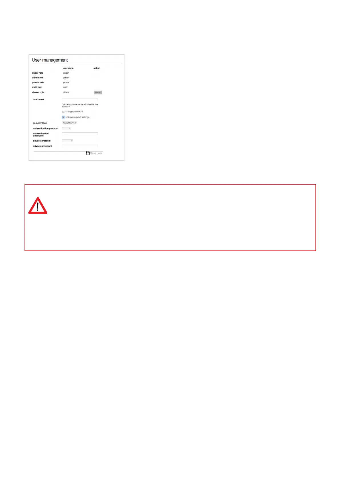 SNMPv3 user settings can be configured in the web interface: tab