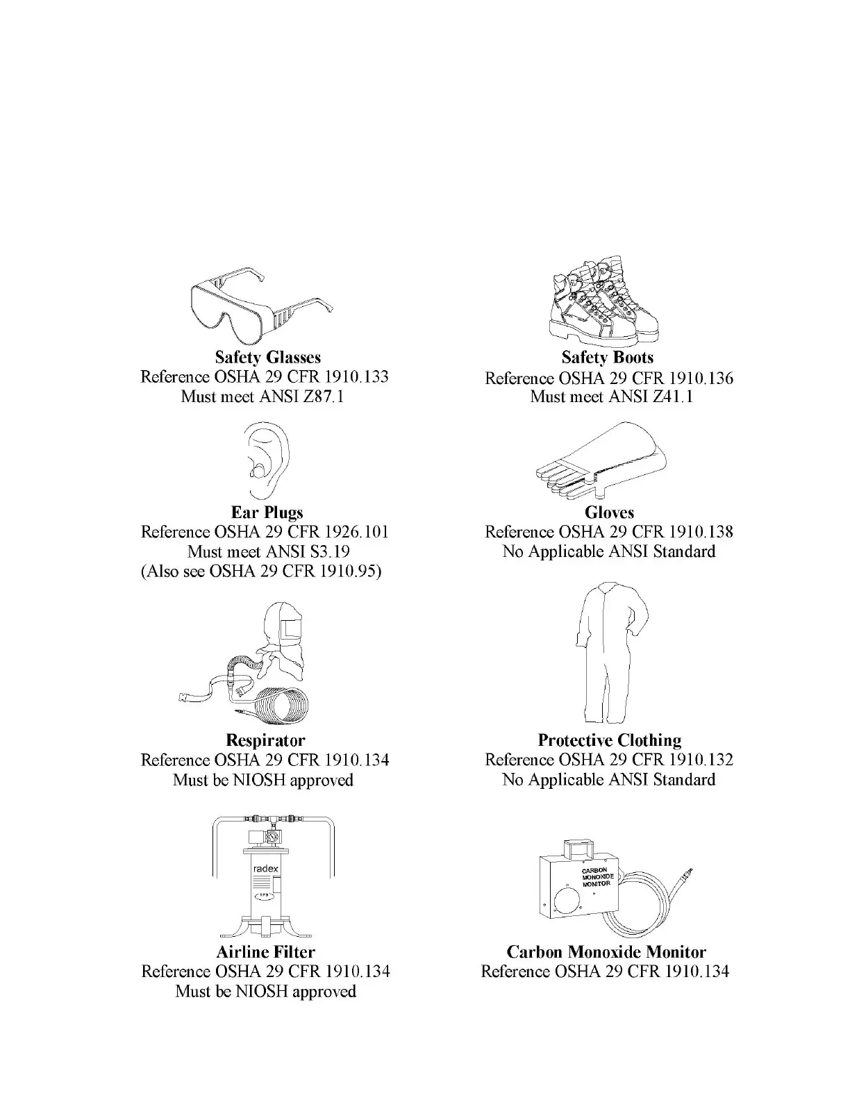 operator. Also identified are the OSHA references for each and the ANSI standard each PPE