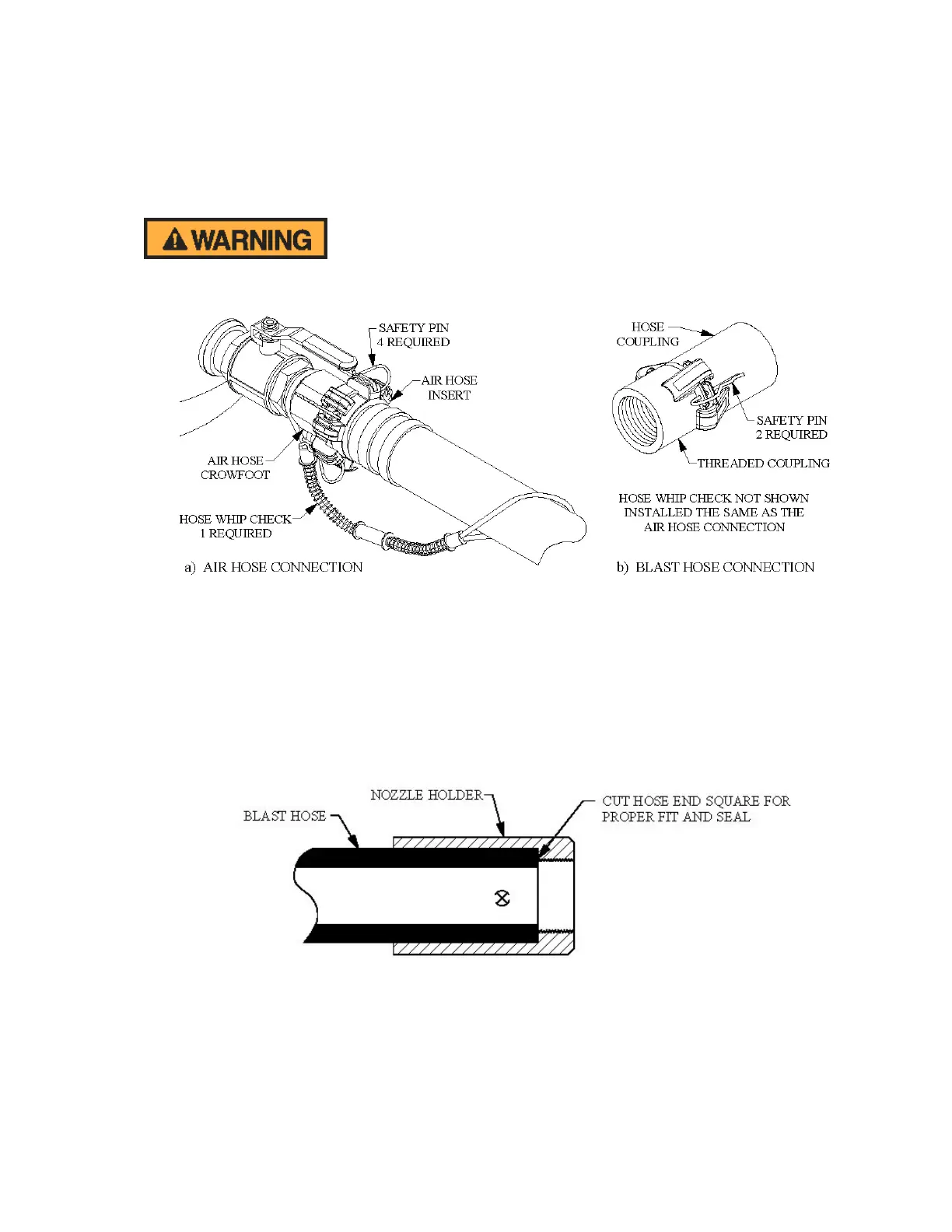 Failure to install safety pins on all air and blast hose couplings can result in hose disconnects