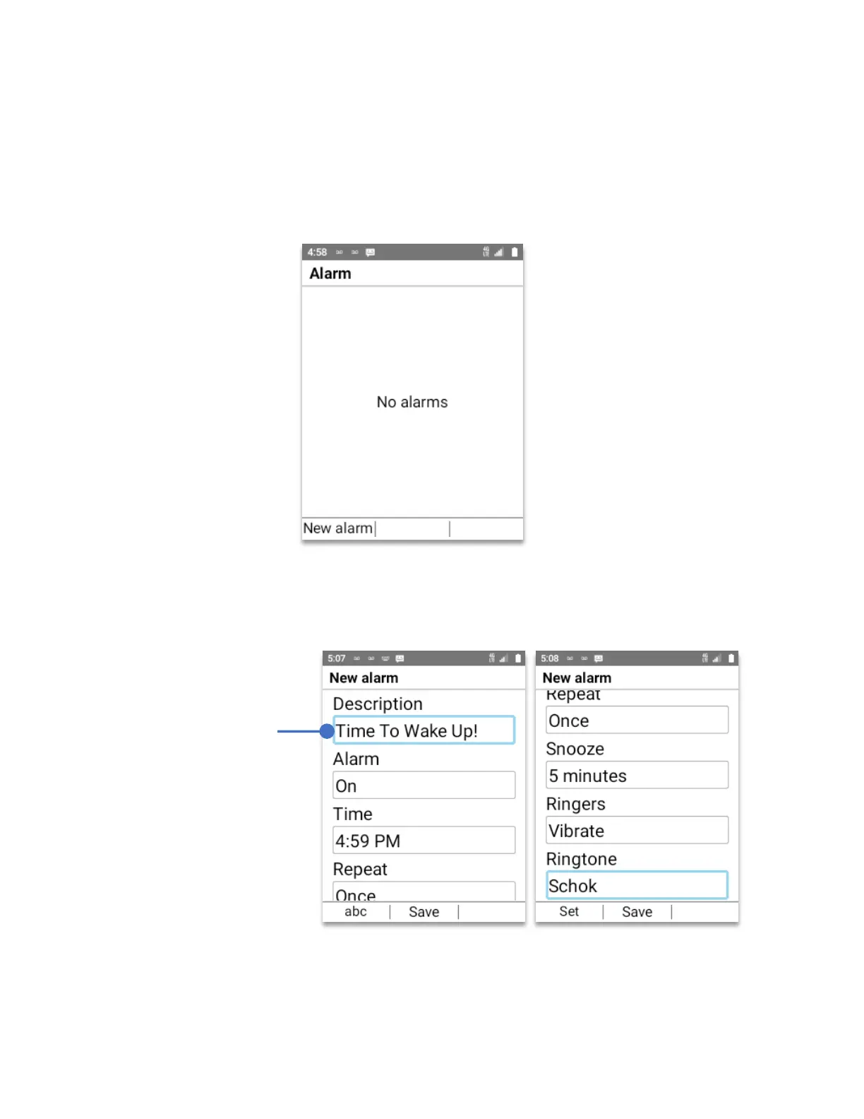 The alarm is set and will appear with a clock icon on the top notification bar.