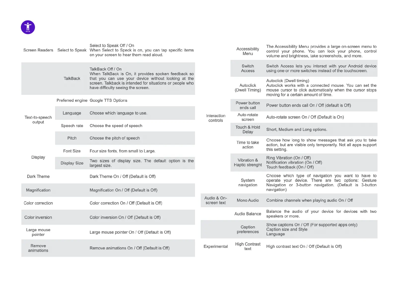 SCHOK Volt SV55 - Accessibility Features; Select to Speak and TalkBack; Text-to-Speech Output Options; Display Adjustments