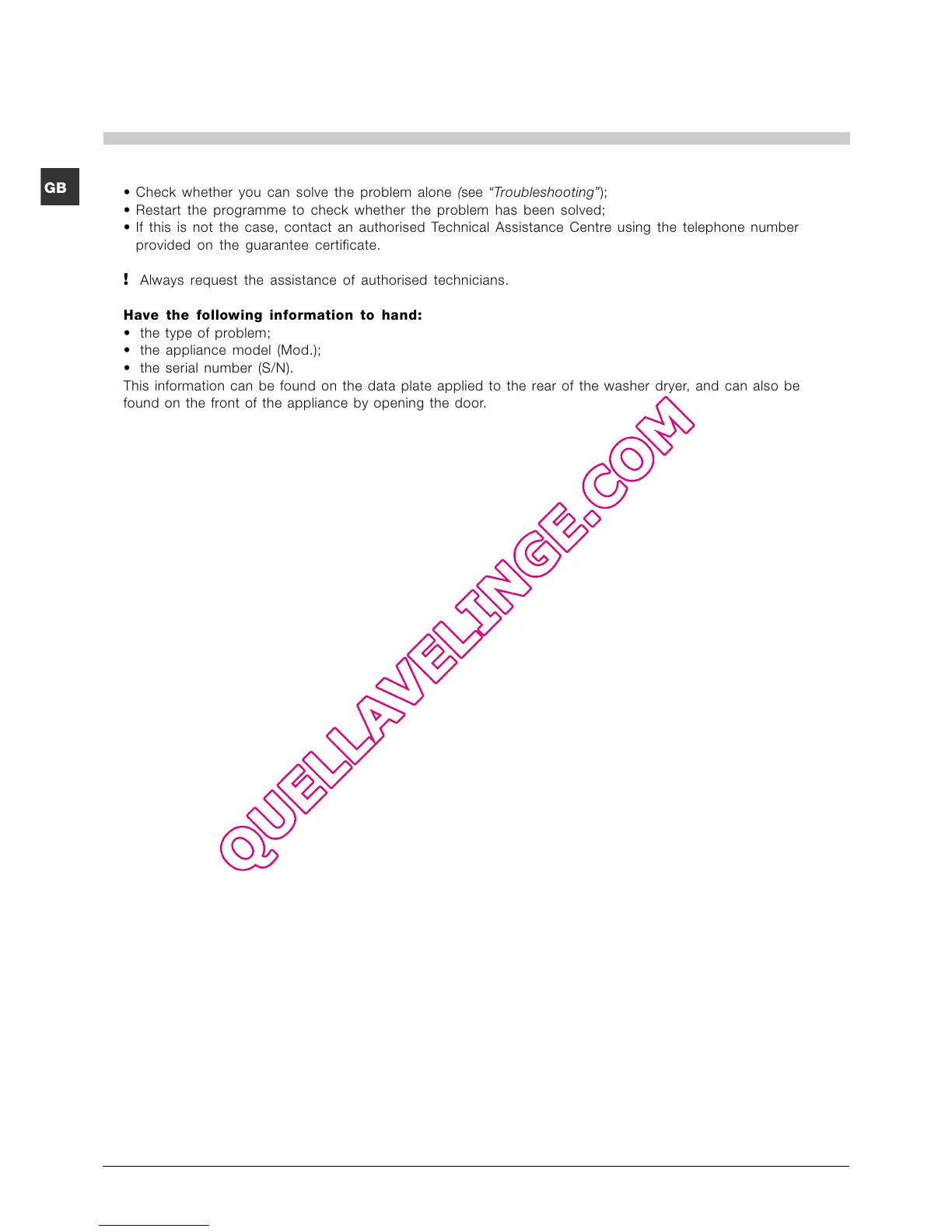 If this is not the case, contact an authorised Technical Assistance Centre using the telephone number