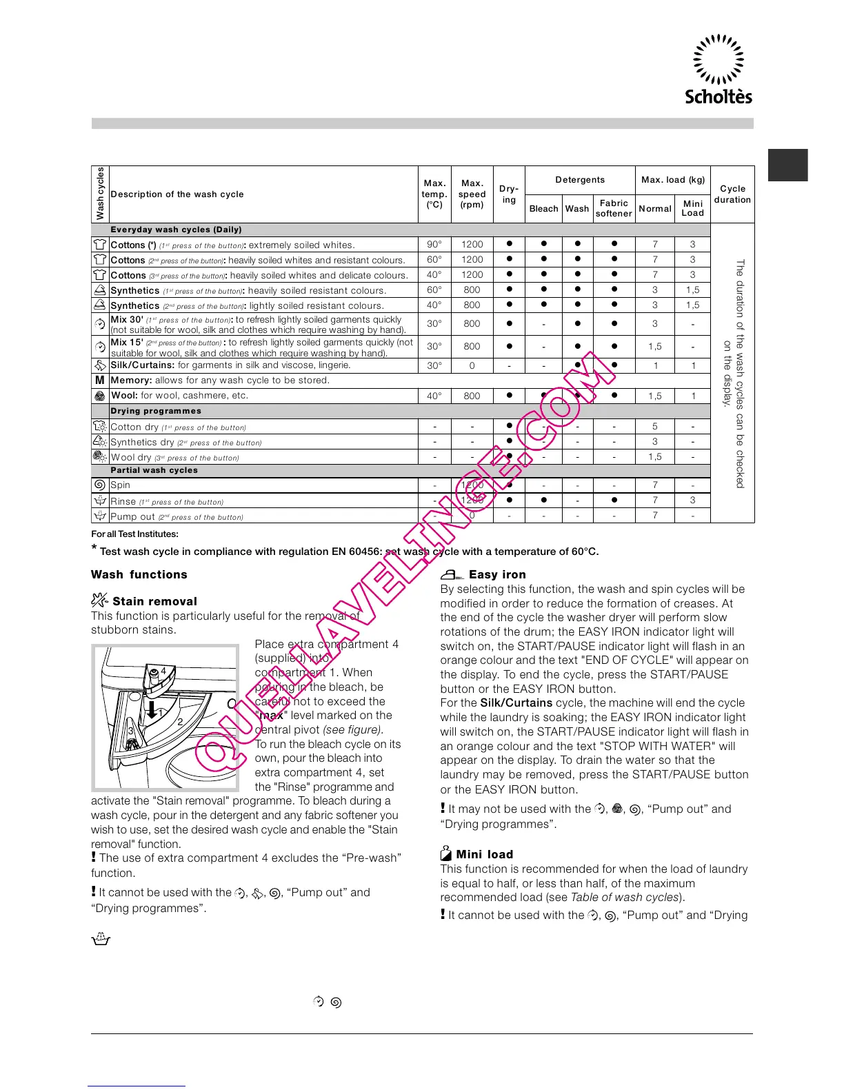 * Test wash cycle in compliance with regulation EN 60456: set wash cycle with a temperature of 60°C.