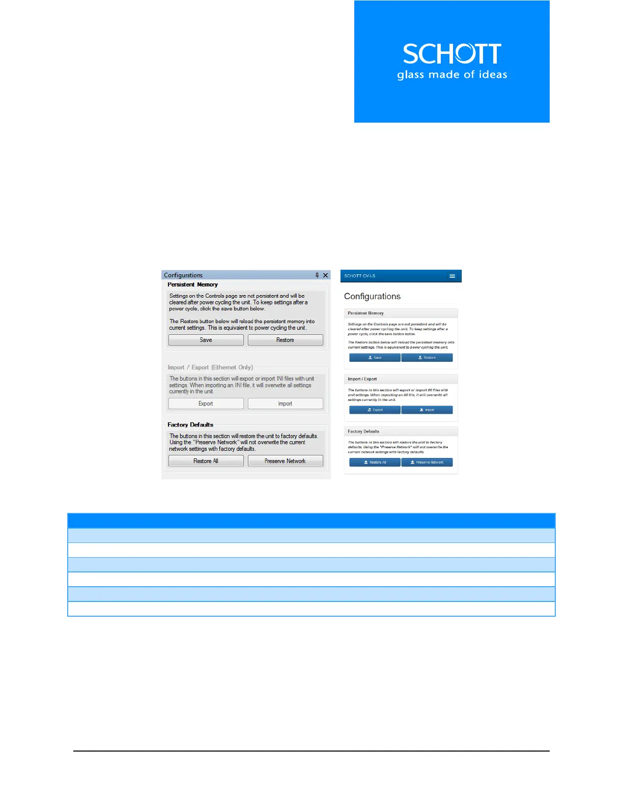 The Configurations section is used to modify the unit memory. Current settings can be saved / restored,