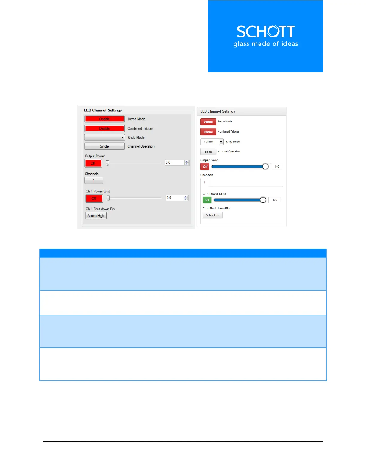 The LED Channel Settings section controls the basic functionality of the LED. When operating in this