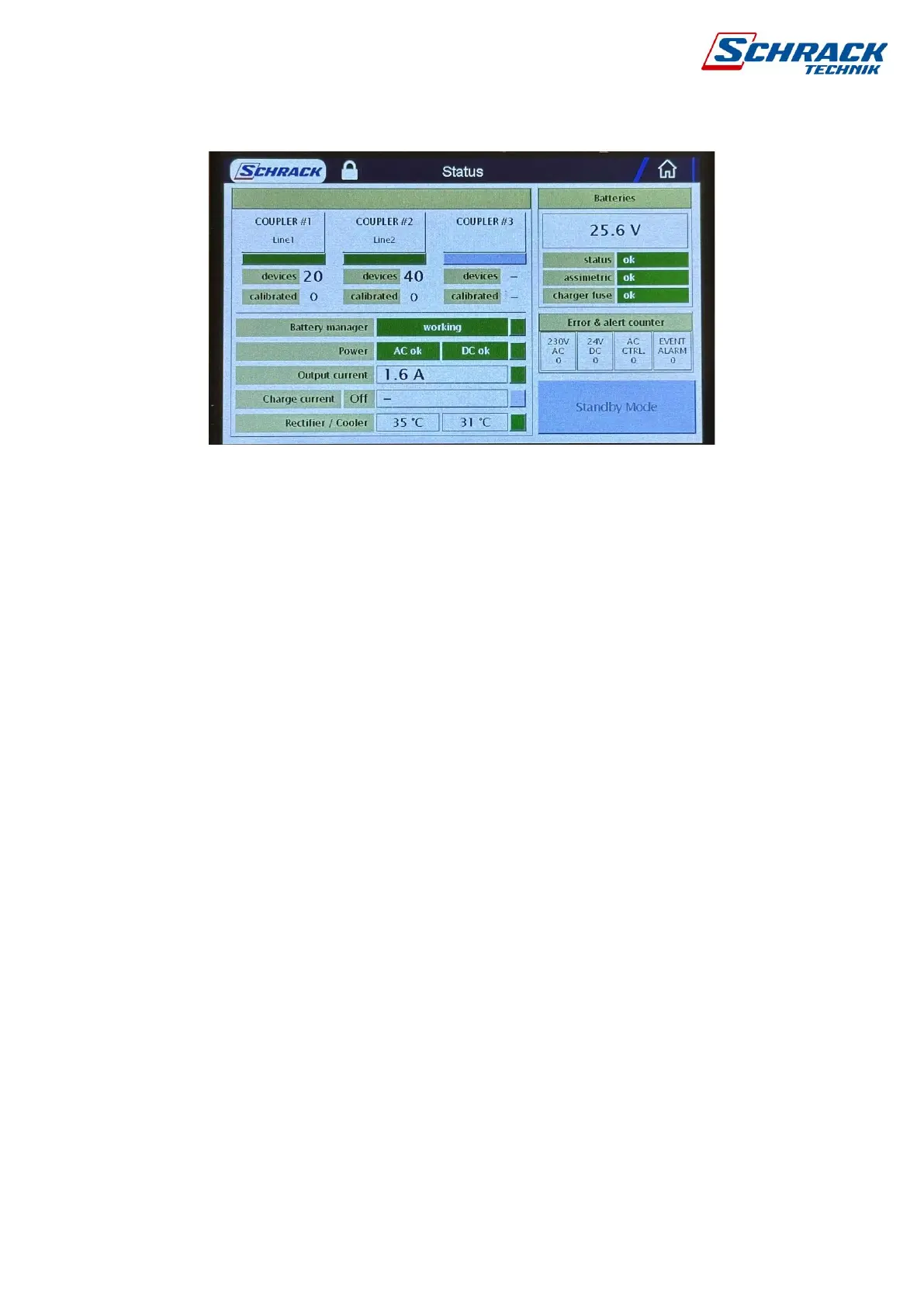 Battery Manager Information: Status OK or Error. In case of supply voltage, AC and DC