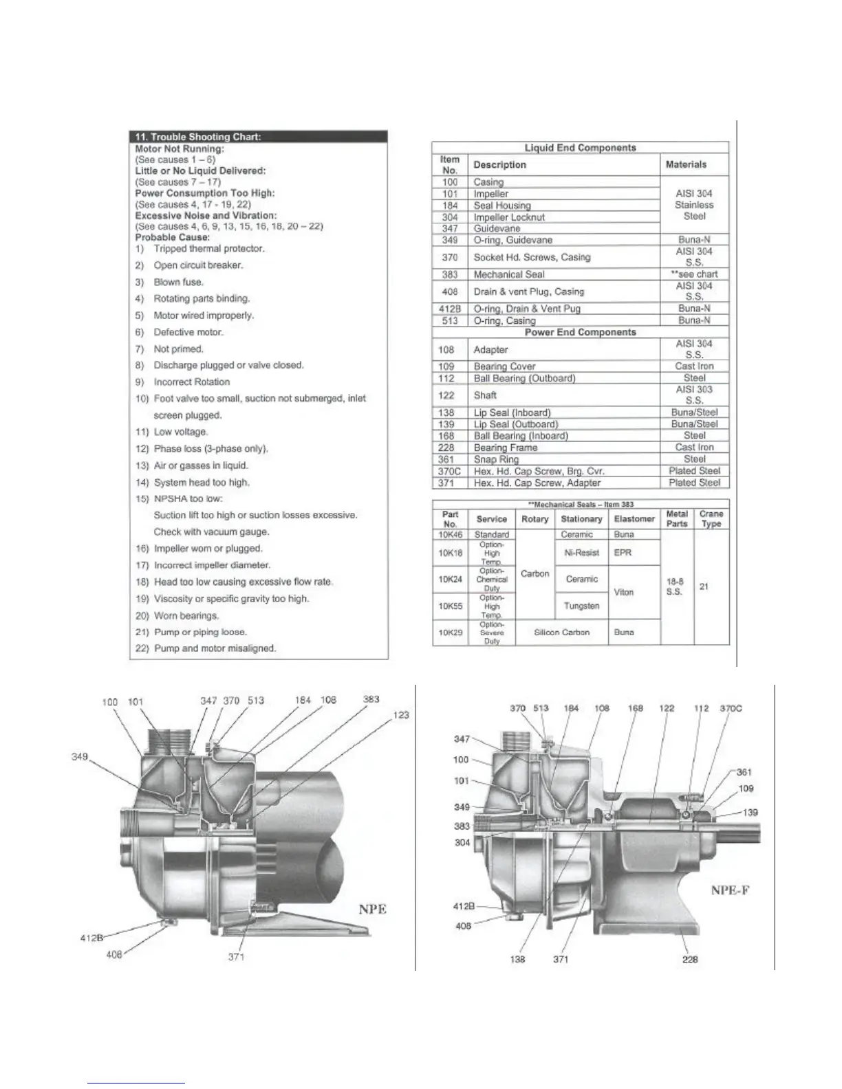 Schreiber Engineering 300AC-MRI - Pump Trouble Shooting Chart; Liquid End Component Identification; Power End Component Identification; Mechanical Seal Specifications