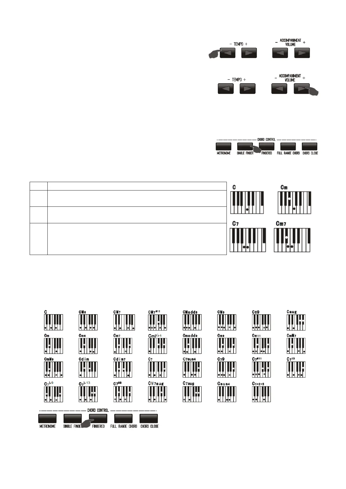 Drücken Sie „Accompaniment +/-“ um die Begleitungslautstärket im