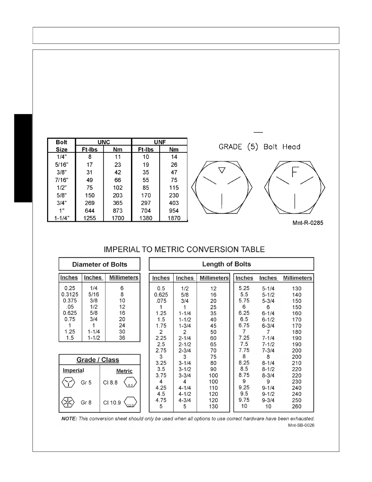 Recommended Torques in foot pounds for SAE Grade 5 bolts, based on dry assembly: Mnt-R-0002