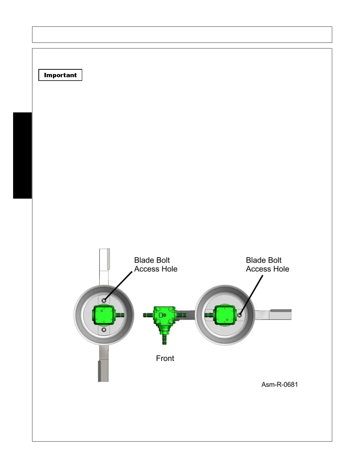 driveline until one blade bolt is visible. Check underside of the deck for the blade position of the rotor not visible