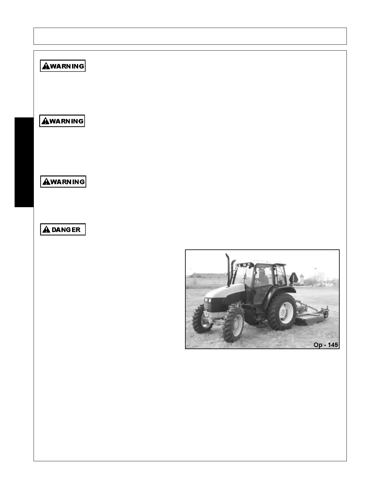 300 feet (90 m) in front and to the sides of the tractor and mower. Make sure that you can