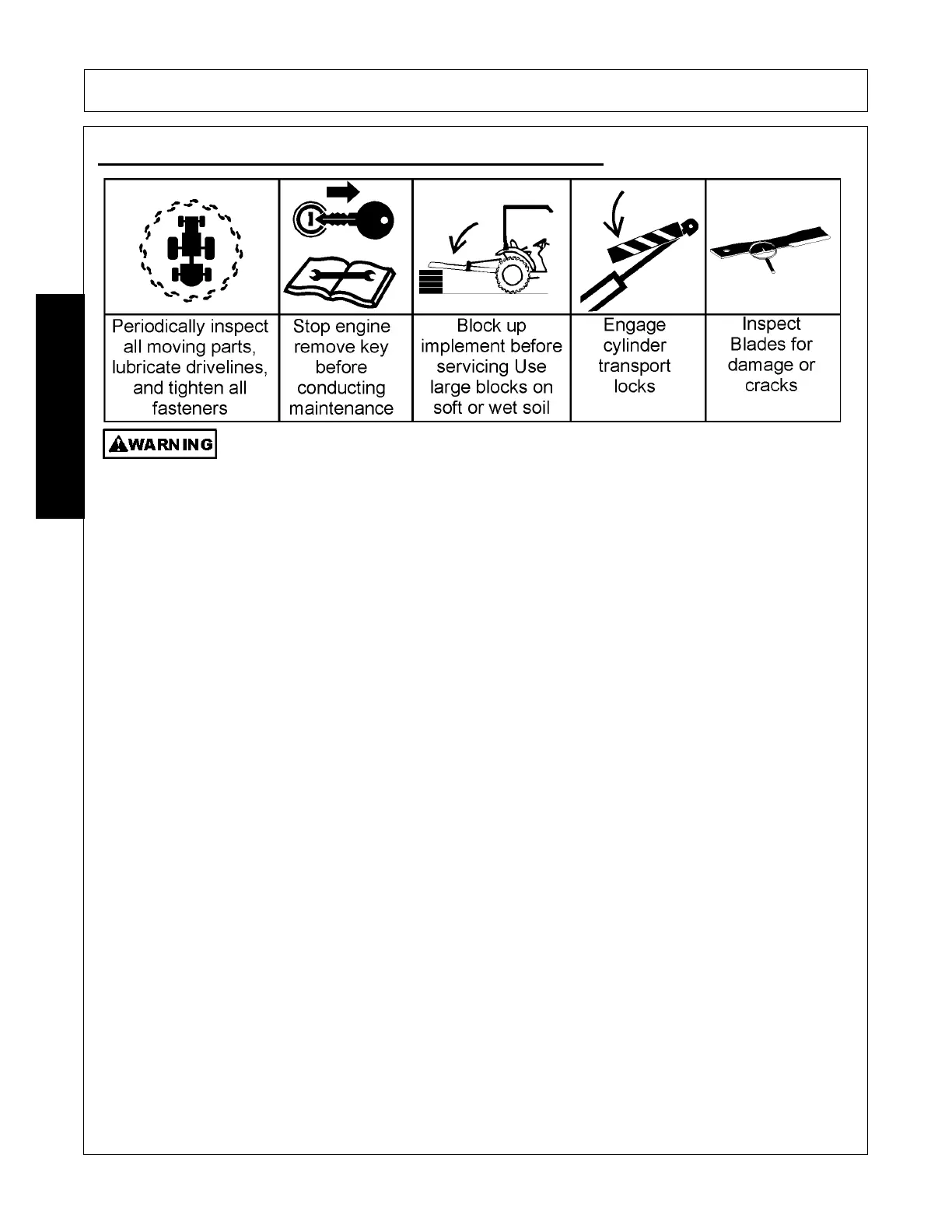 SECURELY support or BLOCK UP raised implement, framework and lifted components before working underneath equipment.