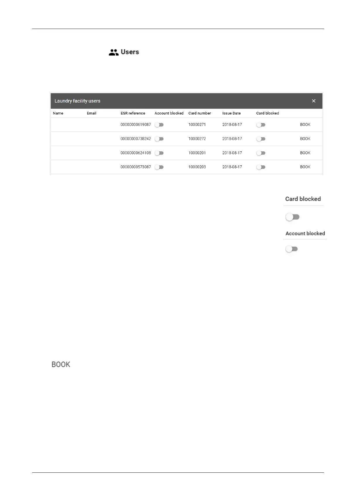 To do this, search for the card in the user overview and click on the “Book” button.
