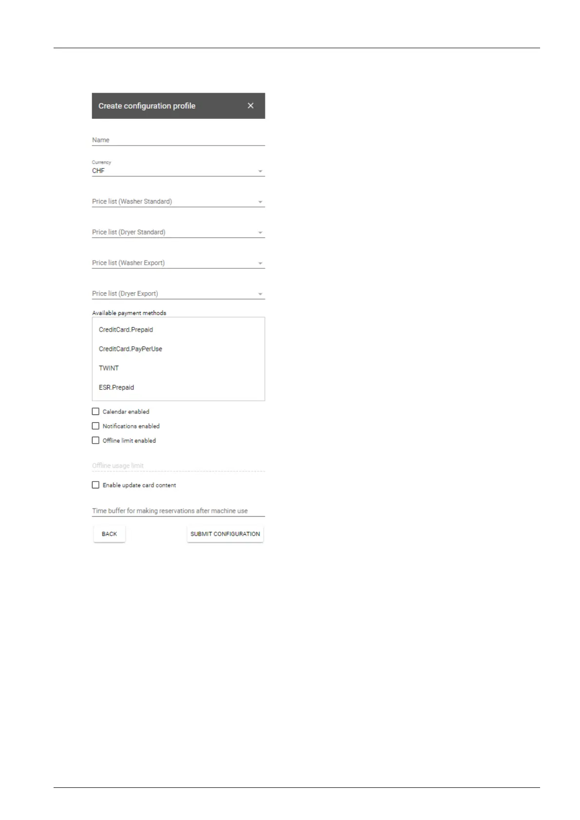 Currently only the currency “CHF” is available.