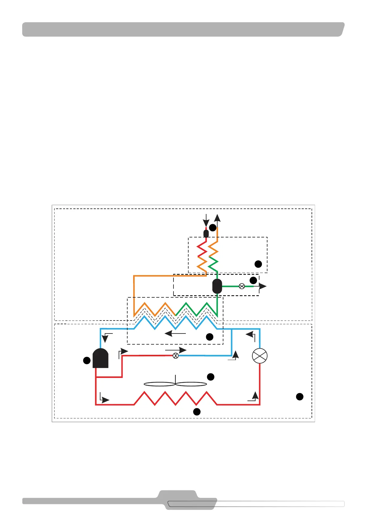 es comprimido elevando la presión y la temperatura. Enseguida entra en el condensador (5), que posee un ventilador (6) responsable por la