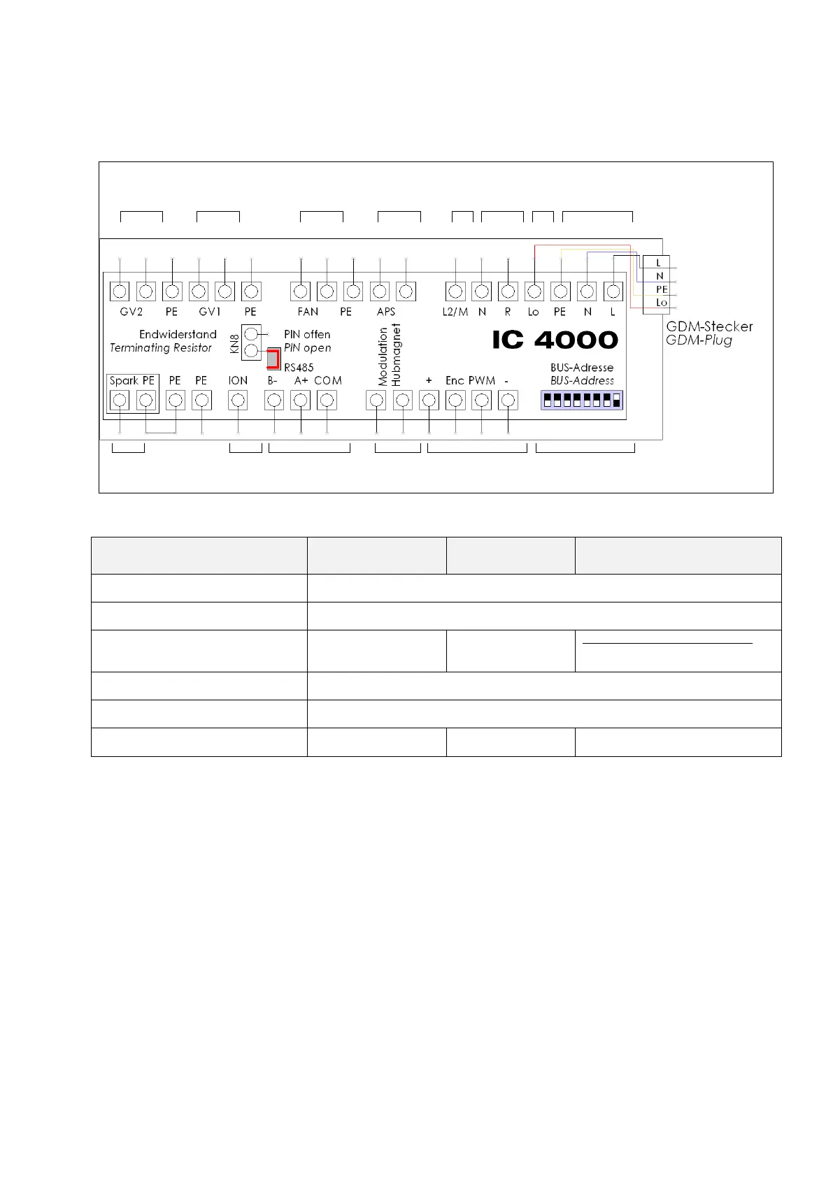 Figure 37: [IC 4000 connections as per delivery status: Terminal resistance PIN open, GDM plug wiring: L/N/PE/Lo]