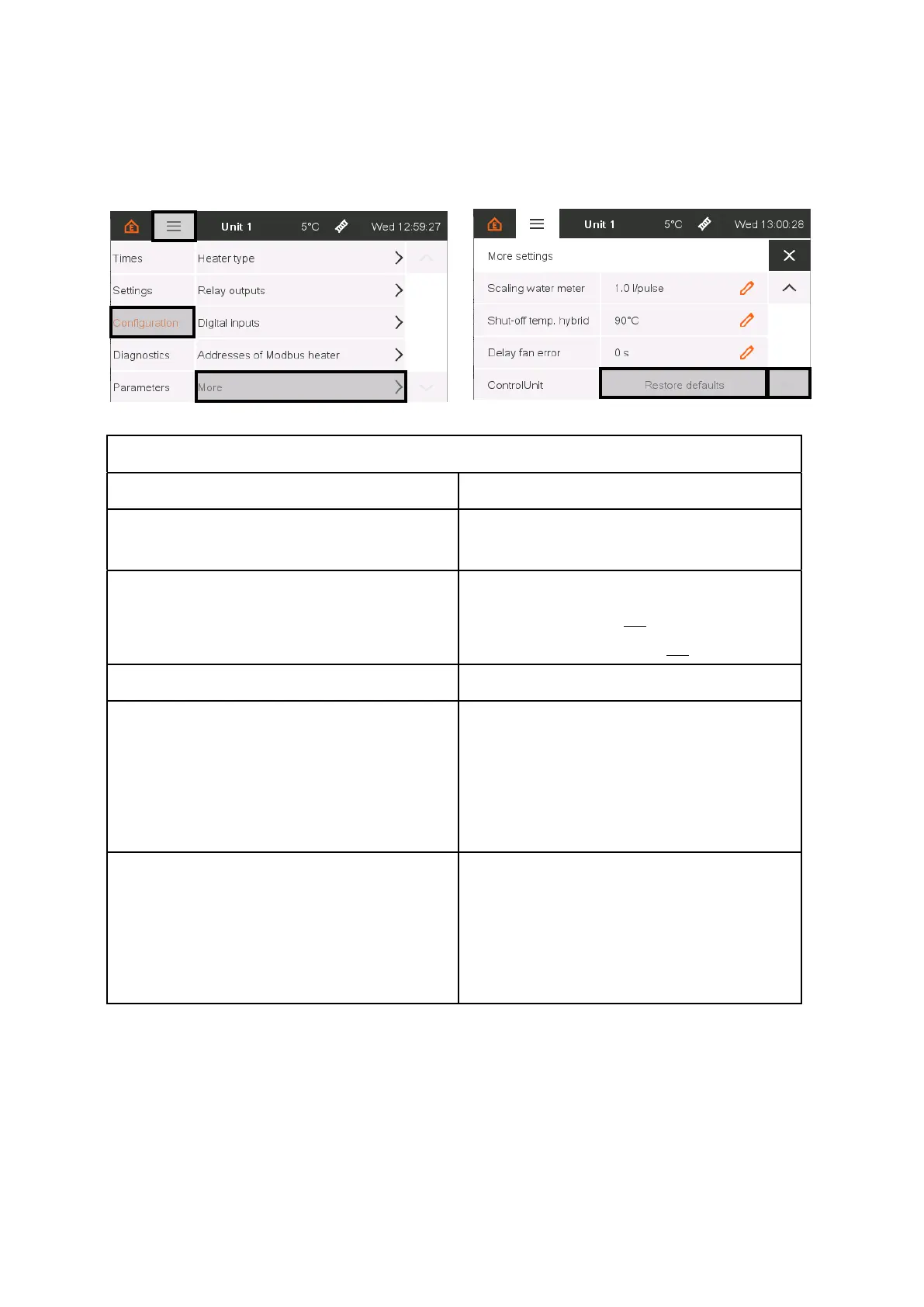 Setting the factory settings: Configuration - More - Control unit factory settings