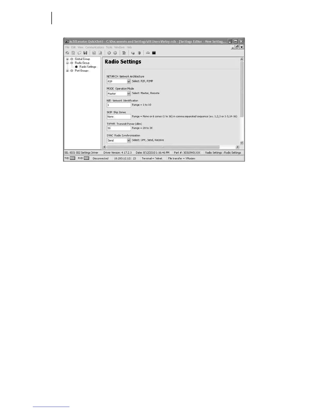 Figure 3.18 shows the settings for the master radio at the Repeater location. The SYNC